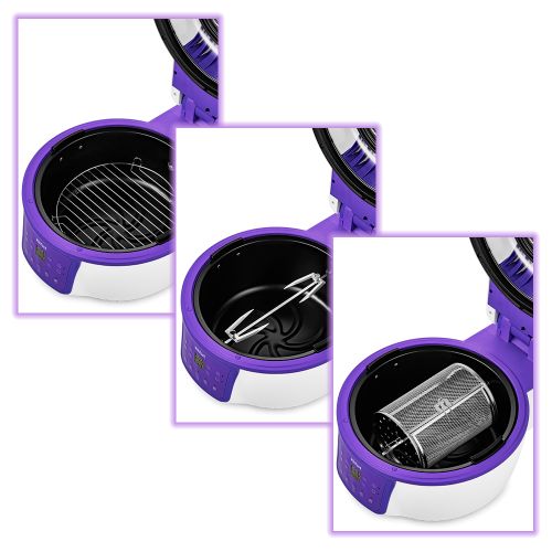 - В комплекте к аэрогрилю идут вертел для приготовления курицы целиком, решётка, вращающаяся корзина. На решётке можно располагать продукты или термостойкие чаши и готовить в них. Вращающаяся корзина подходит для приготовления картошки-фри и других блюд.