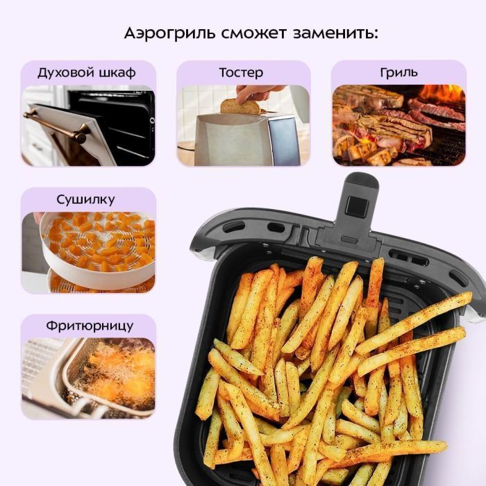 Аэрогриль оснащён сенсорным управлением и семью автоматическими программами приготовления, в трех из которых включается пар. Программы позволяют использовать готовые шаблоны настроек, разработанные специально под конкретные блюда.