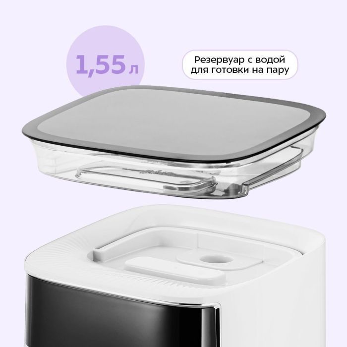 Прибор оснащен резервуаром для воды ёмкостью 1,55 л, откуда вода подается помпой (водяным насосом) в бойлер. При приготовлении на пару сохраняются все витамины и полезные микроэлементы, вы получаете диетические блюда с минимумом усилий.