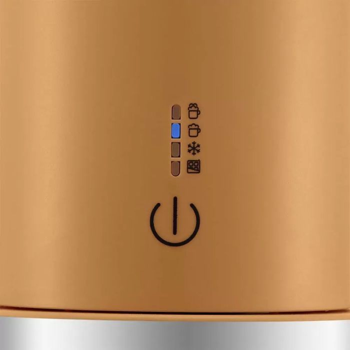 Мощность 400 Вт, антипригарное покрытие, объем 400 мл, рабочая ёмкость 50-250 мл, длина шнура 0.7 метра, размер устройства 105 х 105 х 189 мм, 4 режима: горячий шоколад, вспенивание без подогрева, плотная пенка с подогревом и лёгкая пенка с подогревом, 2 насадки.