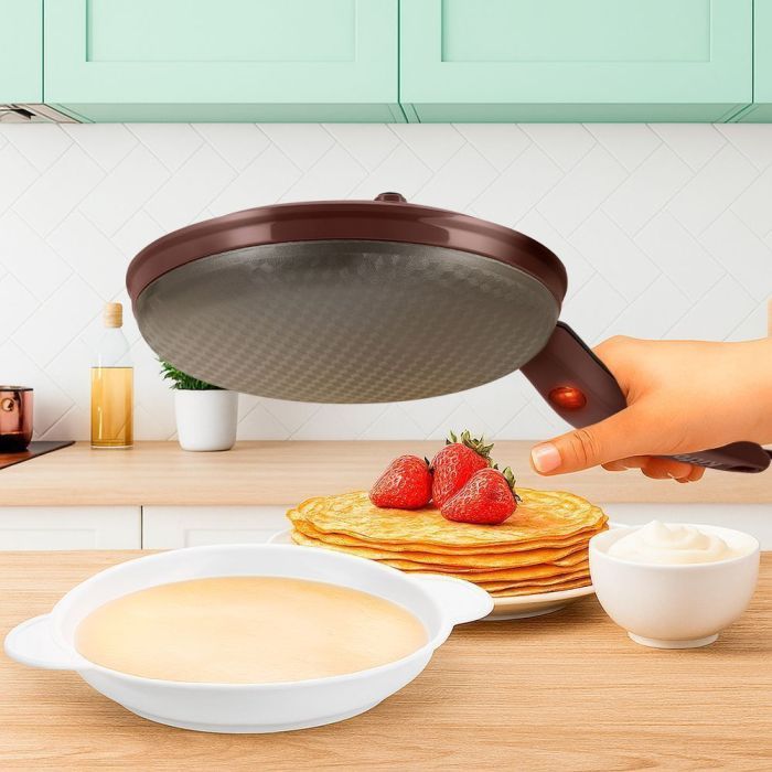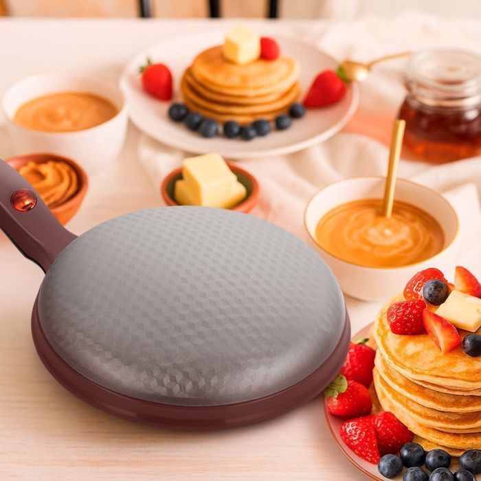 - Благодаря антипригарному покрытию готовить можно с минимальным количеством масла: масло добавляется в тесто, поэтому при выпечке оно не разбрызгивается в разные стороны. Блинница оснащена термостатом для поддержания постоянной температуры.