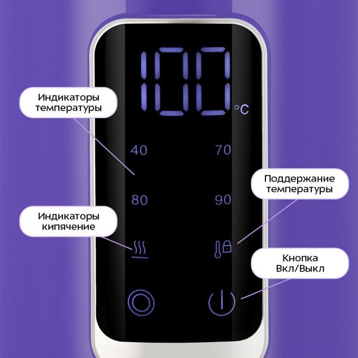 Чайник также оснащён функцией поддержания температуры воды в течение 2-х часов. Температура контролируется встроенным в дно термодатчиком. На LED-дисплее отображается текущая температура воды в чайнике, а при установке температуры – температура нагрева.