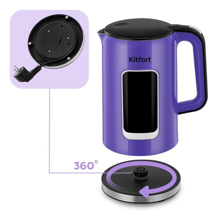 Подставка с центральным контактом даёт возможность располагать на ней чайник в любом положении, обеспечивая вращение на 360°. Снизу имеется отсек для хранения шнура, в который можно смотать излишки шнура электропитания.