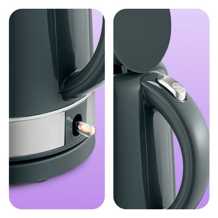 - После нажатия на переключатель загорится световой индикатор, и прибор начнёт нагреваться. Когда вода закипит, чайник автоматически отключится. Чтобы открыть чайник, воспользуйтесь кнопкой на ручке.