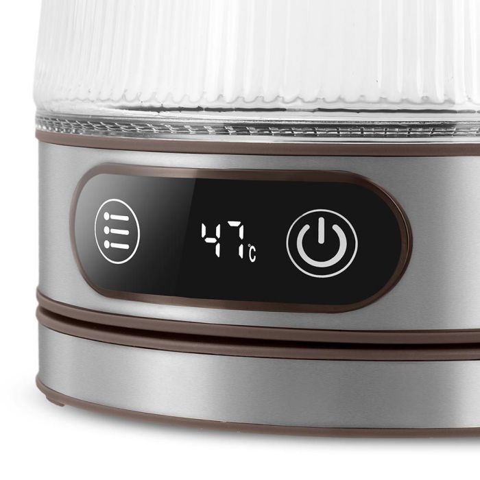 Дисплей отображает текущую температуру воды в чайнике, а при установке температуры – температуру нагрева и поддержания. Кнопка «Вкл/Выкл» включает кипячение, при этом меняется подсветка чайника. Кнопка «Температура» выбирает температуру нагрева.