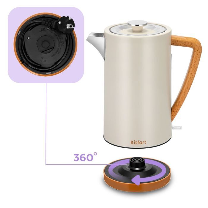 - Подставка с центральным контактом даёт возможность располагать на ней чайник в любом положении, обеспечивая вращение на 360°. Крышка чайника снимается, что облегчает уход за прибором.