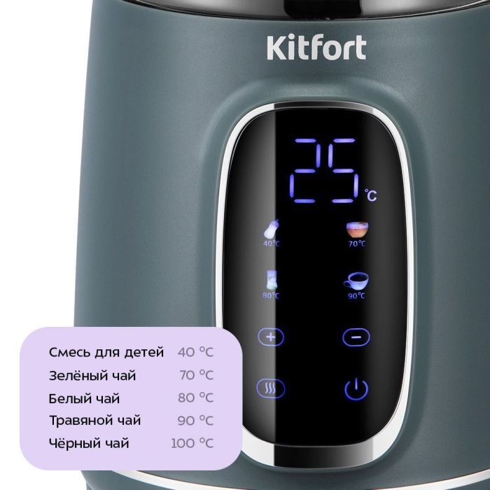 Электрический чайник КТ-8755 подходит для кипячения и нагрева воды где угодно. Он позволяет установить температуру от 40 до 100 °С с шагом в 5 °С. Также можно быстро выбрать 40, 70, 80 или 90 °С одним нажатием кнопки. Мощность 1850-2200 Вт. Ёмкость 1,7 л.