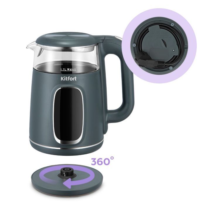 - Подставка с центральным контактом дает возможность располагать на ней чайник в любом положении, обеспечивая вращение на 360°. Прибор имеет защиту от перегрева и от включения без воды. Снизу подставки имеется отсек для сматывания шнура.