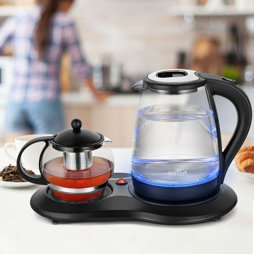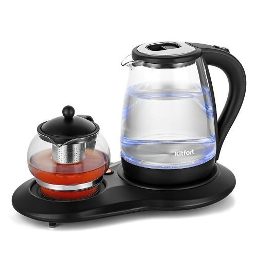 Стильный и функциональный чайный набор Kitfort КТ-6178 состоит из чайника ёмкостью 2 л, кувшина с фильтром для заварки ёмкостью 1 л и базы. Мощность 1500 Вт . Материал колбы чайника стекло.
