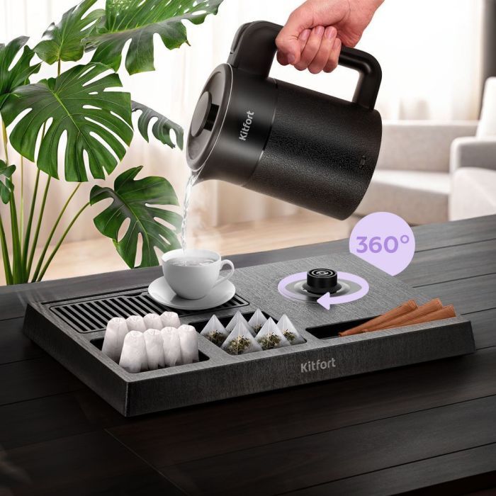 Чайный набор КТ-6690 состоит из чайника и подставки с отсеками для чайных принадлежностей, а также отсеком для чашек с решёткой и поддоном для капель. Подставка с центральным контактом даёт возможность крутить чайник на ней на все 360°. Мощность 800 Вт. Ёмкость чайника 0,6 л.