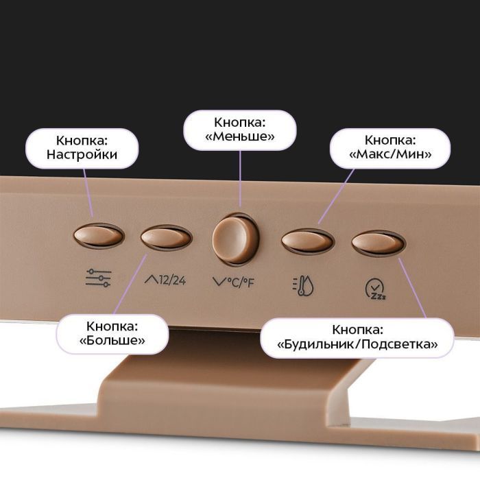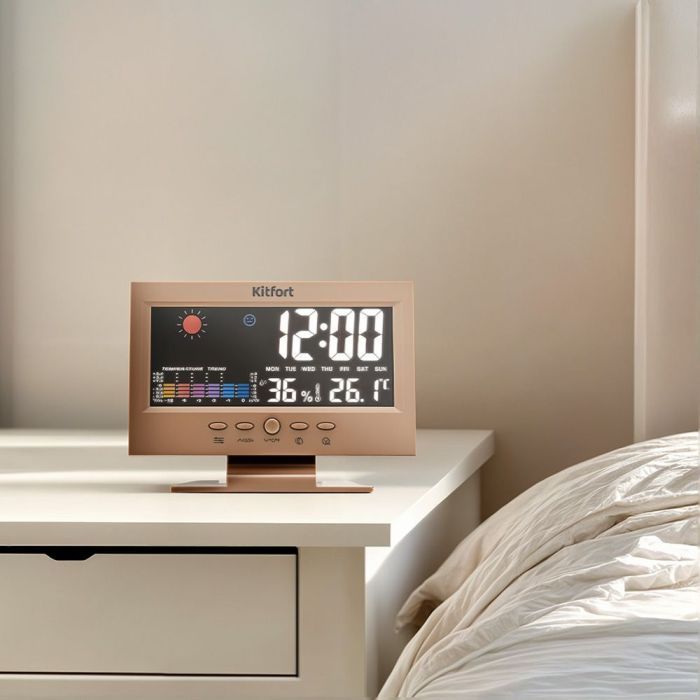 - Помимо температуры и влажности, на дисплее отображаются время, день недели и пиктограмма погоды, а также индикатор комфорта. Управление часами осуществляется с помощью 5 кнопок на корпусе.
