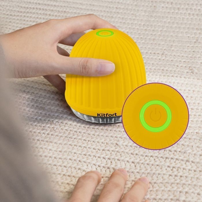 - Управление прибором осуществляется всего лишь одной кнопкой. После включения у устройства начнут вращаться ножи, а на корпусе загорится зелёным индикатор работы. После очистки катышков повторным нажатием выключите прибор.