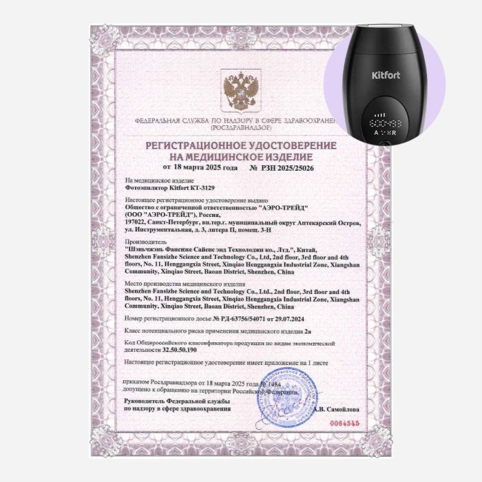 Фотоэпилятор Kitfort КТ-3129 является медицинском изделием. Товар обладает регистрационным удостоверением на медицинское изделие. Мощность 36 Вт. Количество режимов 2.