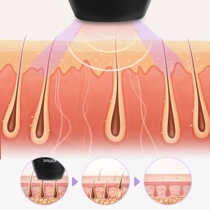 Для удаления волос в домашних условиях в устройстве используется технология интенсивных световых импульсов (IPL). Принцип действия: световой импульс воздействует на меланин в волосах. Тепло идёт к корню волоса, разогревает и разрушает волосяной фолликул.