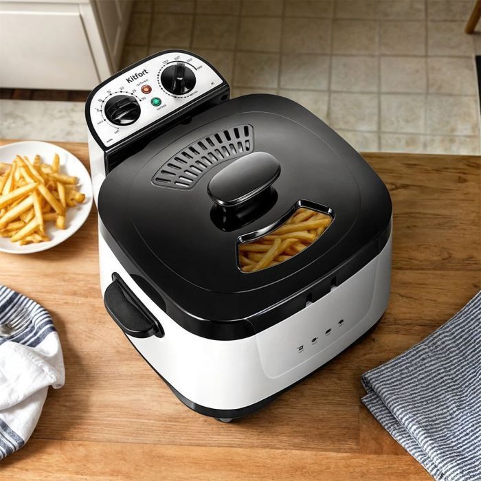 - В крышке фритюрницы имеется окно, через которое вы сможете следить за готовностью блюда. Крышка съёмная, что упрощает уход за фритюрницей. В крышке находится фильтр, который сдерживает распространение запаха и маслянистых испарений во время жарки.