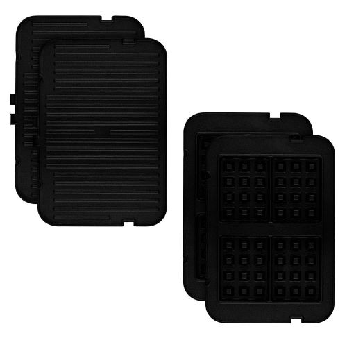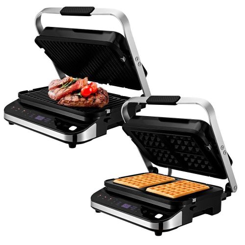 - Электрогриль оснащён панелями для гриля с ребристой поверхностью, с помощью которых вы можете приготовить мясо, овощи, сосиски и многое другое. Также в комплекте идут две дополнительные панели для приготовления вкуснейших домашних вафель!
