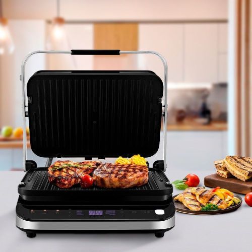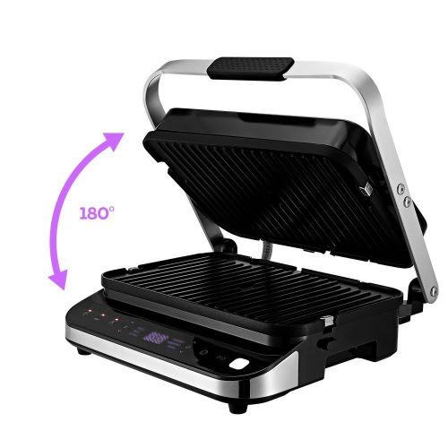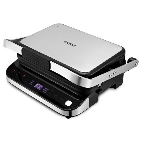 - С помощью панели управления вы можете выбрать автоматический режим работы: мясо, рыба, курица, сосиски, гамбургер и бекон. Вы также можете вручную установить температуру нагрева до 230°C. Кроме того, прибор обладает функцией разморозки продуктов.