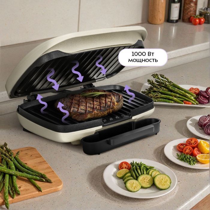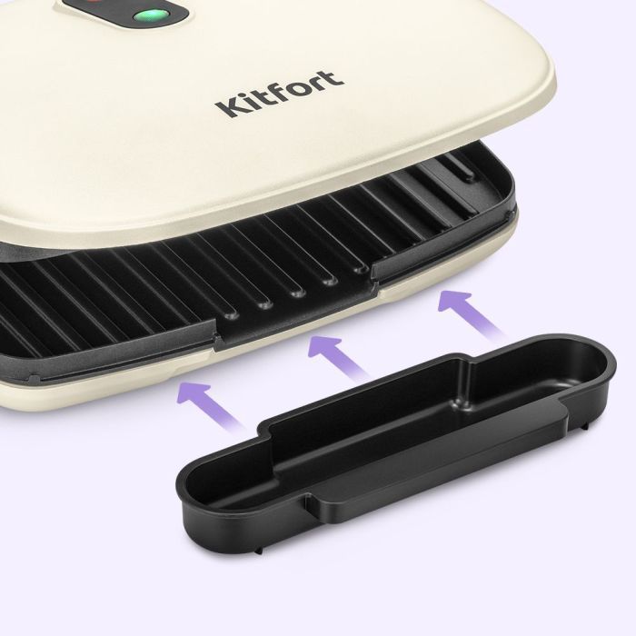 - Одним из преимуществ электрогриля КТ-3686 является съёмный поддон для сбора жира и сока, которые образуются во время готовки. Это не только упрощает процесс приготовления, но и помогает поддерживать чистоту на кухне.