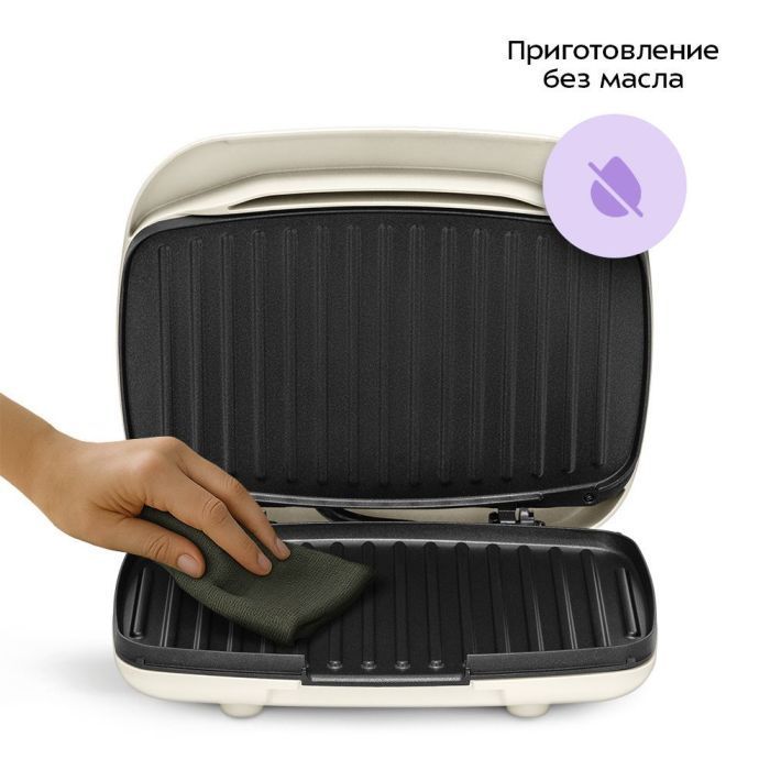 - На панели электрогриля нанесено антипригарное покрытие, позволяющее легко очищать поверхности и готовить без масла. Во избежание ожогов и повреждения панелей используйте силиконовую кисточку (не входит в комплект).