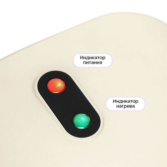- Гриль оснащён термостатом и индикаторами питания и нагрева. При включении загорается индикатор питания. При остывании панелей автоматически включается нагрев для поддержания температуры. Это сопровождается периодическим миганием индикатора нагрева.