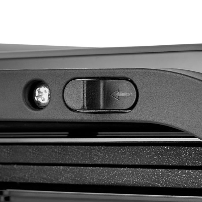 - Фиксатор сбоку гриля удерживает крышку в закрытом состоянии, что делает готовку, транспортировку и хранение более удобными. Также вы можете зафиксировать крышку в приоткрытом состоянии. Для этого откройте крышку и, удерживая ее в таком положении, опустите