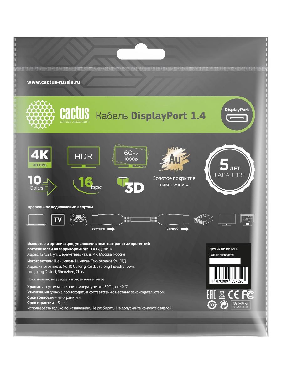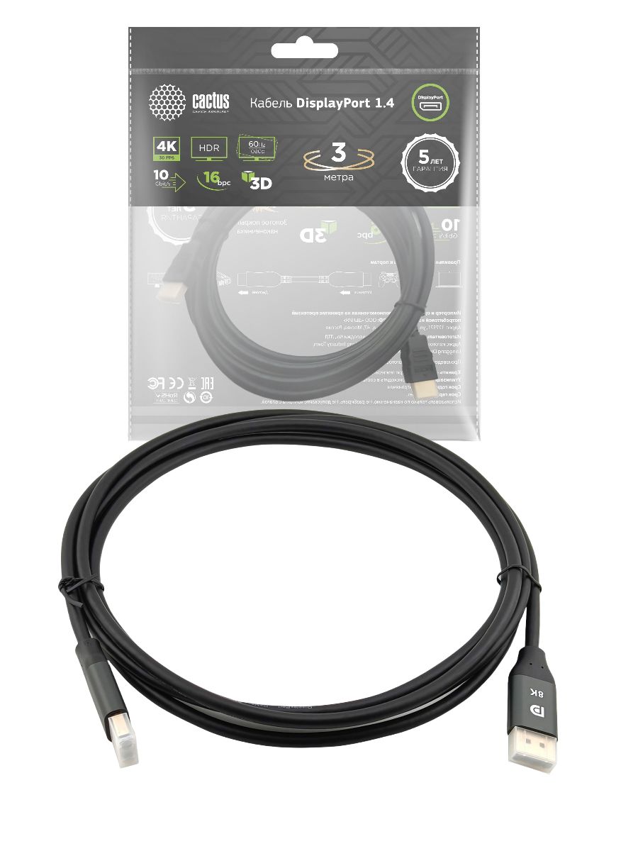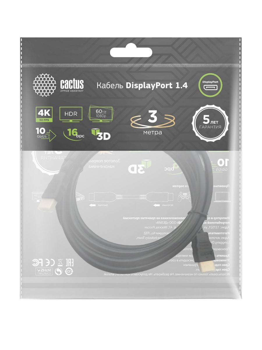 Кабель аудио-видео Cactus CS-DP-DP-1.4-3 DisplayPort (m)/DisplayPort (m) 3м. позолоч.конт. черныМодель: CS-DP-DP-1.4-3