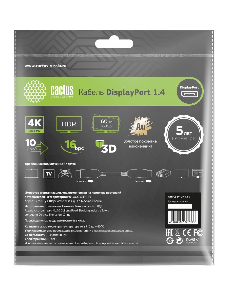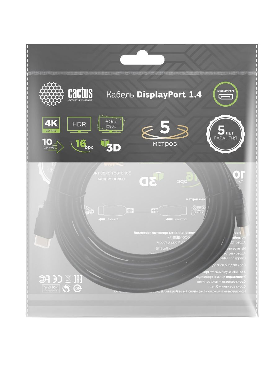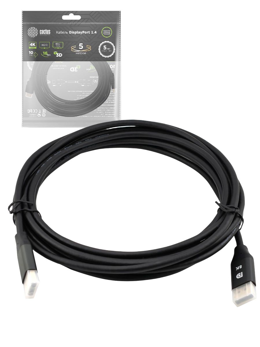 Кабель аудио-видео Cactus CS-DP-DP-1.4-5 DisplayPort (m)/DisplayPort (m) 5м. позолоч.конт. черныМодель: CS-DP-DP-1.4-5