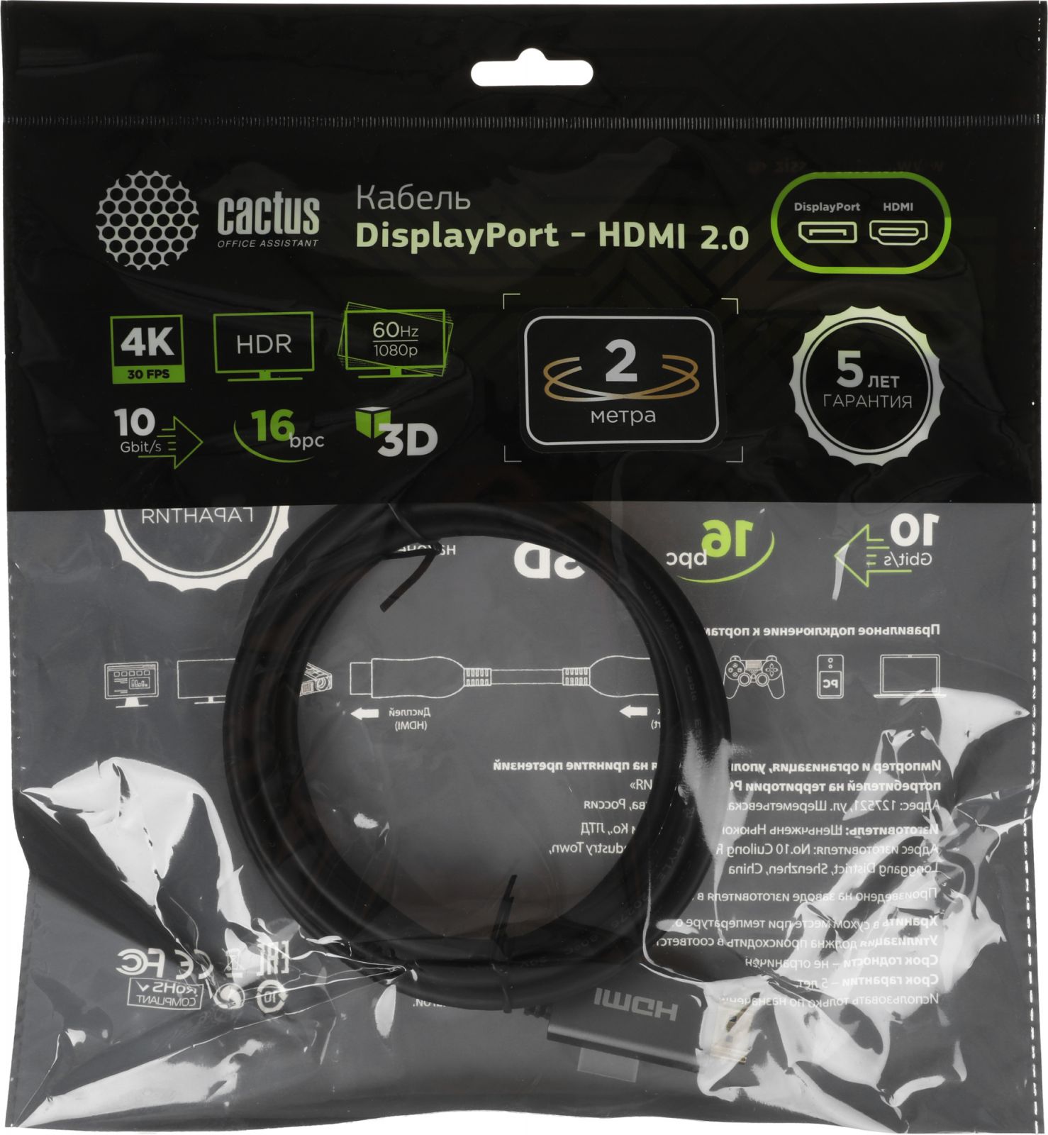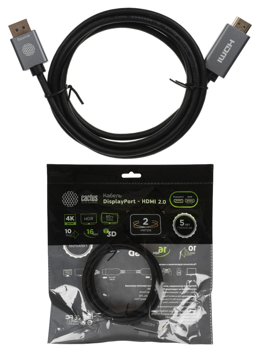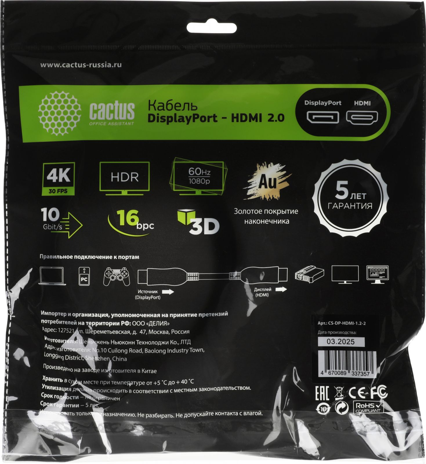 Кабель аудио-видео Cactus CS-DP-HDMI-1.2-2 DisplayPort (m)/HDMI (m) 2м. позолоч.конт. черныйМодель: CS-DP-HDMI-1.2-2