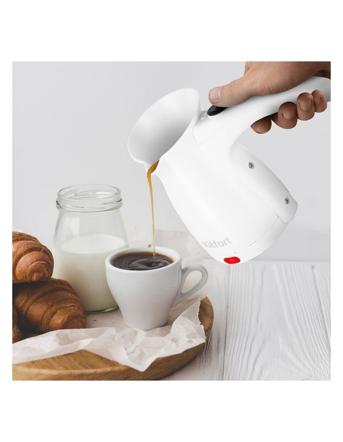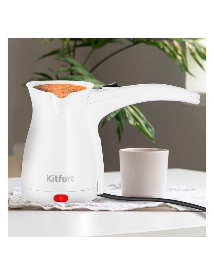 Электрическая турка Kitfort КТ-7451 варит кофе по-турецки. С ней вы сможете быстро и легко сварить натуральный кофе на 5 чашек по 60 мл. Устройство состоит из турки и базы. Кофе по-восточному или кофе по-турецки — кофе, приготовленный путем варки мелкомолотых зерен кофе в воде. Чтобы сварить кофе по-турецки, в турку засыпают молотый кофе, заливают воду и нагревают ее почти до кипения. При этом образуется пенка. Если своевременно не прекратить нагрев, пенка перельется через край, и кофе «убежит». Турку необходимо отключить вручную после поднятия пенки. Кофе по-турецки подается горячим в небольших чашках (около 60 мл). Согласно традиции его пьют не сразу, как только его налили в чашку, а через некоторое время, когда кофейная гуща осядет на дно. Ручка турки пластиковая, не нагревается и удобно лежит в руке.