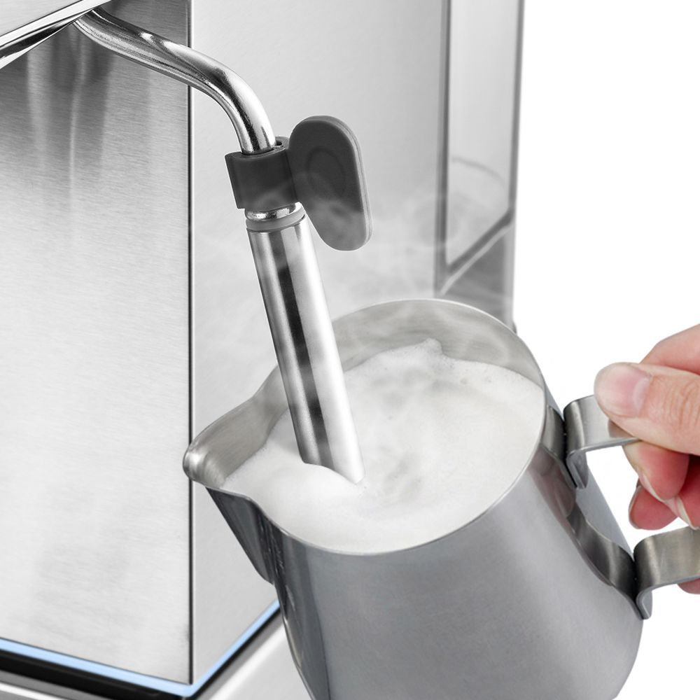 - Для подачи пара и горячей воды в кофейной станции есть паровая трубка – стимер. Стимер погружают в холодное молоко, включают подачу пара и взбивают молочную пенку. С помощью стимера вы также можете подогреть остывший чай или молоко.
