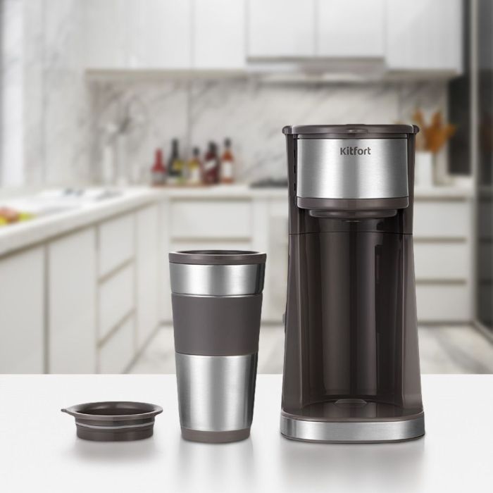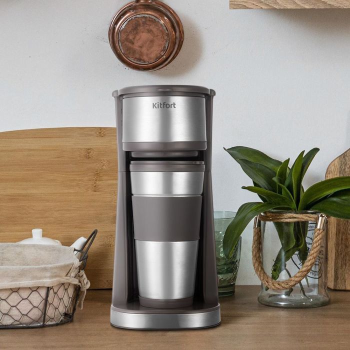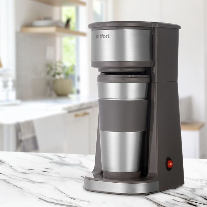 Капельная кофеварка КТ-7314 готовит ароматный чёрный кофе из молотого кофе одним нажатием кнопки. В кофеварке горячая вода медленно (по каплям) поступает в фильтр с молотым кофе. Пройдя через фильтр, вода попадает в термокружку, сохраняющую тепло кофе. Мощность 650–750 Вт. Ёмкость термокружки 450 мл. Ёмкость резервуара для воды 420 мл.