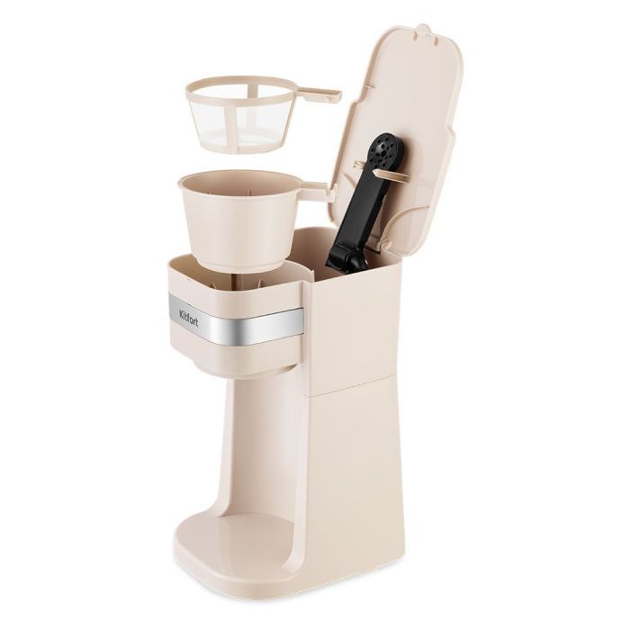 В кофеварке горячая вода медленно поступает в фильтр с молотым кофе. Многоразовым фильтром можно пользоваться любое количество раз. Сетка фильтра изготовлена из нейлона. Фильтр вмещает 20 грамм молотого кофе, а резервуар для воды имеет ёмкость 420 мл.