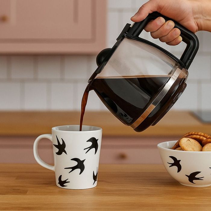 - Кофейник ёмкостью 1,8 литров рассчитан на 12 чашек кофе по 150 мл. Кофейник выполнен из стекла, его ручка удобно лежит в руке.