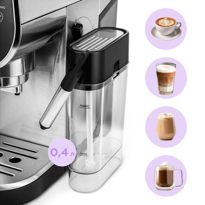 - С помощью автоматического капучинатора, который устанавливается в кофеварку, вы можете сделать молочную пену без особых усилий, просто нажав на кнопку. Автоматический капучинатор представляет - резервуар для молока с крышкой, внутри механизм вспенивания.
