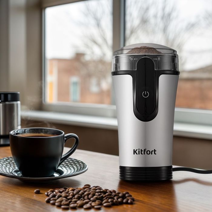 - Через прозрачную крышку кофемолки КТ-7654 можно наблюдать за измельчением зёрен, это удобно для контроля степени помола. Корпус кофемолки выполнен из пластика. Ёмкость чаши составляет 170 мл.