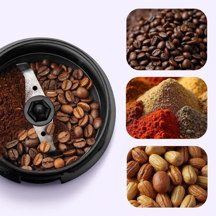 - В чаше кофемолки закреплён блок ножей, которые выполнены из нержавеющей стали. Они предназначены для эффективного измельчения зёрен кофе и специй. При включении кофемолки ножи быстро вращаются и рубят ингредиенты.