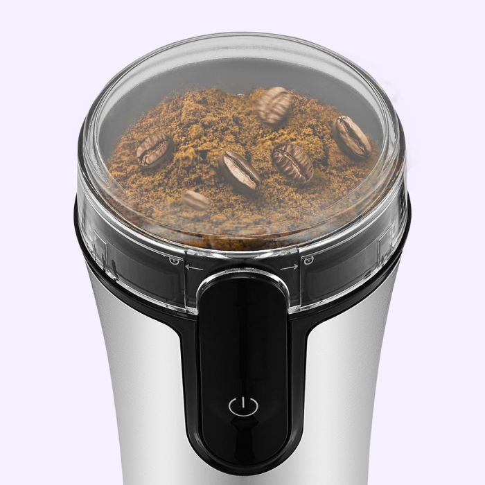 - Кофемолка проста в эксплуатации: она включается простым нажатием на единственную кнопку на крышке. Защитный механизм не позволит включить кофемолку, если верхняя крышка не установлена. Степень помола зависит от продолжительности работы.