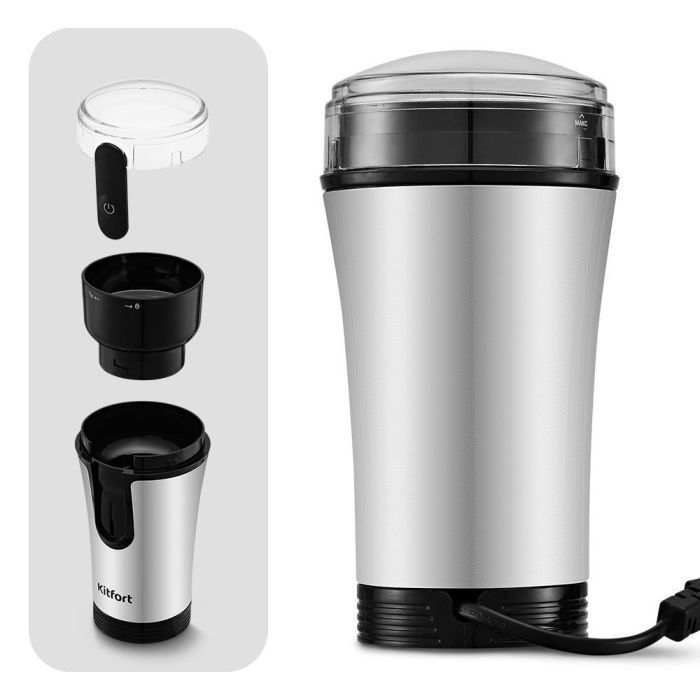 Кофемолка КТ-7654 предназначена для помола кофейных зёрен. Вы также можете использовать устройство для измельчения специй или орехов. Особенности свежего помола в том, что кофейные зёрна максимально сохраняют свои свойства, и кофе остаётся свежим. Мощность 120 Вт. Общая ёмкость чаши 170 мл.