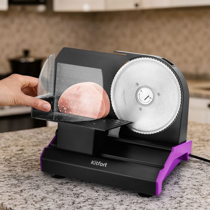 - Защитите свои руки с толкателем. Просто прижмите продукт к ограничителю и безопасно продвиньте к лезвию — ваши пальцы не коснутся ножа. Надёжная защита во время работы!