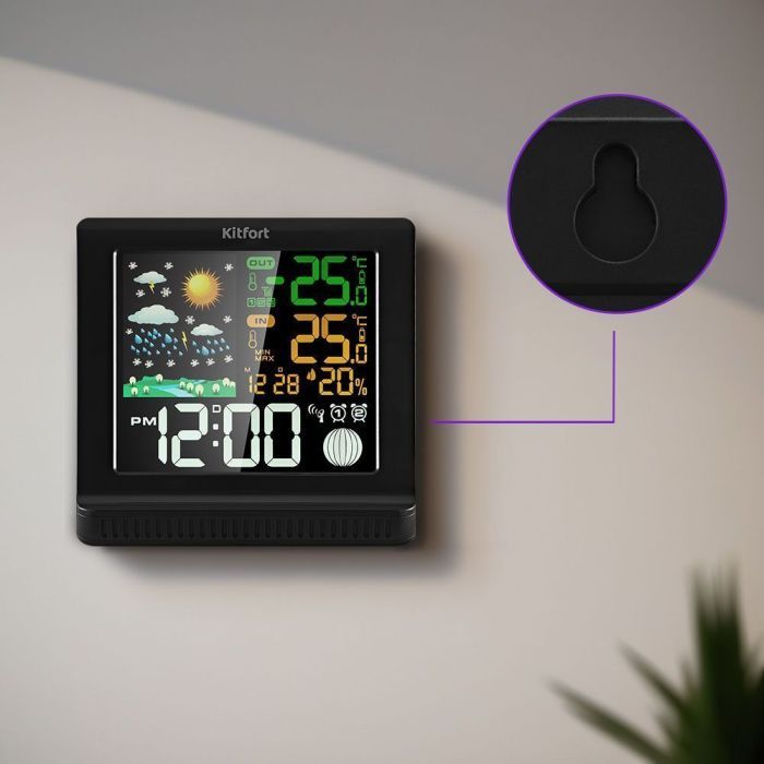 - КТ-3382 показывает max. и min. значение температуры и влажности в помещении, а также температуры на улице за сутки. У устройства цветной экран, на котором хорошо видны все значения. Прибор можно подвесить на стену или поставить на стол.