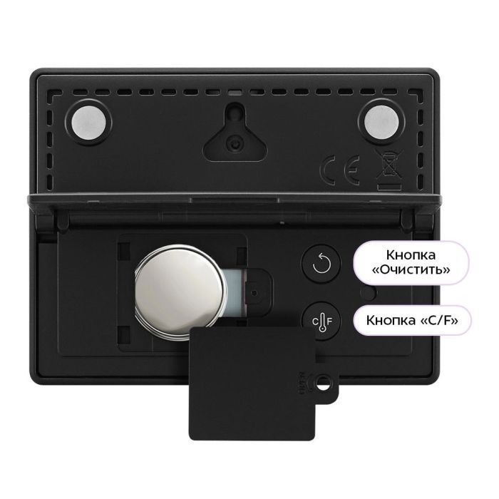 - Данная модель оснащена одним датчиком, у которого есть отверстие для настенного крепления, чтобы получать показания температуры и влажности снаружи помещения. Питание датчика происходит от 2 батареек типа AAA (не входят в комплект).