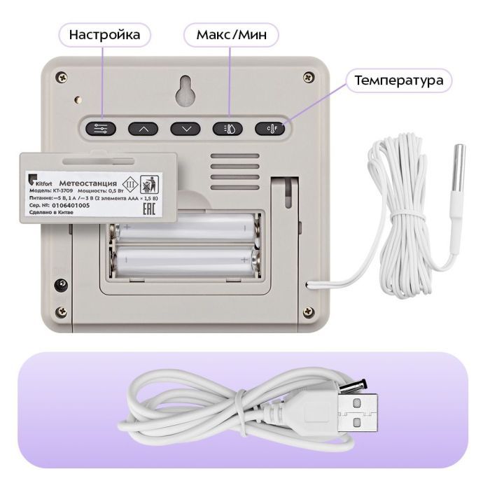 - Метеостанция КТ-3709 оснащена специальным проводным датчиком для получения показания температуры на улице. Погода будет транслироваться в виде условной индикации (картинок) на экране.