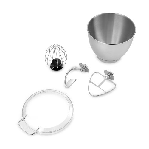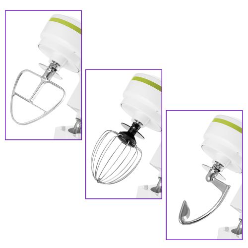 - В комплекте идут венчик для взбивания, крюк для замеса крутого теста, насадка для смешивания и приготовления пюре. Форма насадок и чаши подобраны так, что почти при любом количестве продуктов насадка качественно их перемешает.