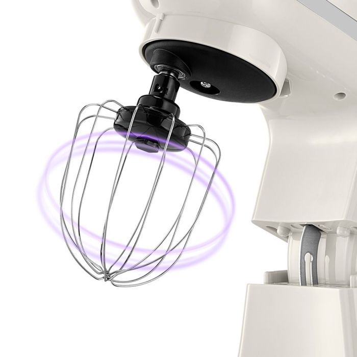 - Планетарный миксер укомплектован несколькими насадками для максимальной пользы на кухне. Венчик будет взбивать яичные белки и сливки, насадка для смешивания используется с негустыми ингредиентами, крюк для замешивания – лучший вариант для густого теста.