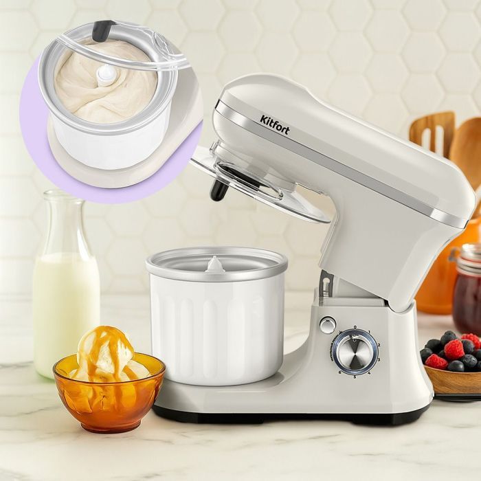 - Замена чаши превращает миксер в мороженицу. Для этого нужно заранее охладить чашу с хладагентом. Затем в неё заливают смесь для мороженого и запускают устройство. Получается идеальная кремовая текстура летнего лакомства!