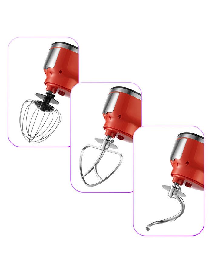 - В комплекте есть три насадки. Венчик поможет взбивать яичные белки, замешивать жидкое тесто. Насадка для смешивания служит для негустых ингредиентов, приготовления пюре, кондитерских смесей. Крюк для замешивания подойдёт для замешивания густого теста.