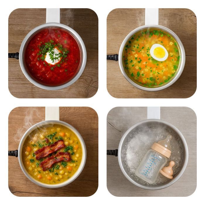 - Суповарку можно использовать не только для готовки супов, но и для подогрева пищи и стерилизации детской посуды.