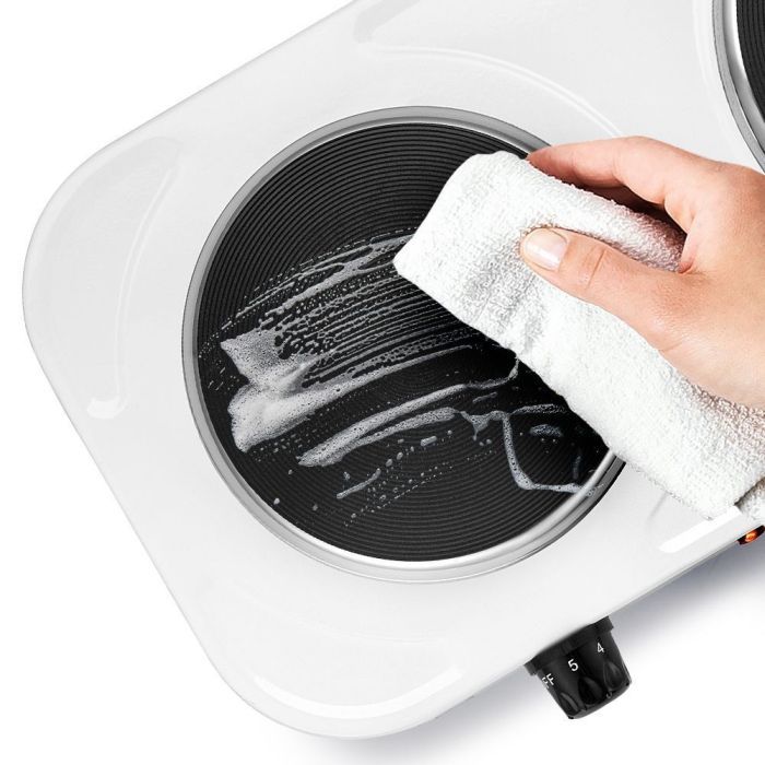 - Корпус и конфорки плиты выполнены из металла, благодаря чему после приготовления еды вы можете с лёгкостью убрать плитку от остатков пищи и прочих загрязнений.