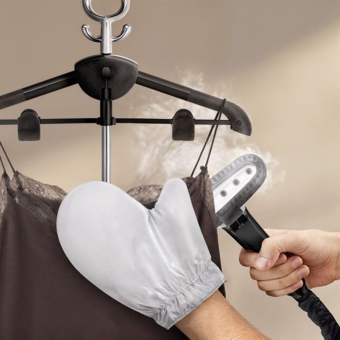 Отпариватель обрабатывает вещи мощной струёй горячего пара, таким образом производя чистку и дезинфекцию, а для того, чтобы не обжечься, в комплекте идёт варежка. Ворсовая щетка-зажим поможет счистить волосы или шерсть с одежды и обивки мягкой мебели.