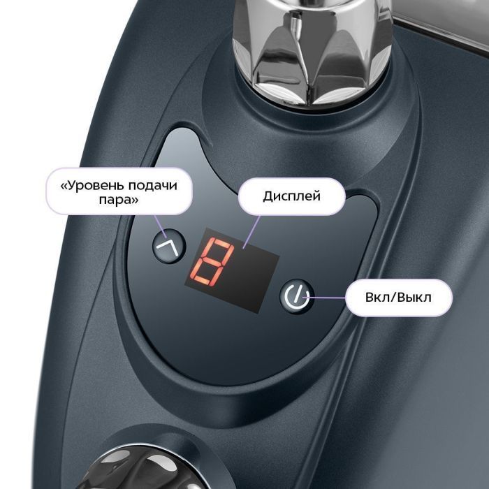 Принцип работы отпаривателя прост: вода из резервуара поступает в бойлер, где нагревается и испаряется. На дисплее отображается уровень подачи пара. Кнопка «Уровень подачи пара» переключает уровень подачи пара. Отпариватель имеет 9 уровней подачи пара.